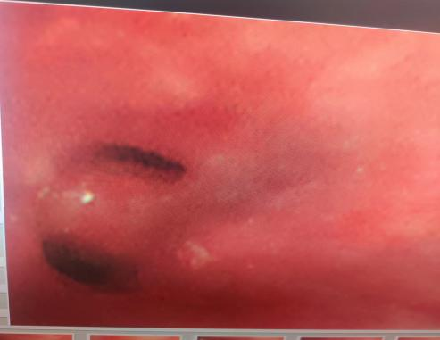 全麻条件下,小浩浩成仰卧位,姜毅教授持气管镜从鼻孔进入鼻腔,边给麻药边进镜。纤支镜下看到,患儿左主支气管及左下基底段开后可见数枚异物,周围可见少许肉芽组织增生,右中叶、右下基底段可见少许黄白色分泌物。医疗团队立即给予生理盐水反复灌洗及吸引治疗,灌洗液浑浊。