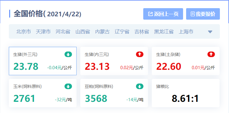 值得一提的是,和生猪养殖息息相关的玉米和豆粕均出现了下跌,玉米的价格下降了32元每吨,达到2761元每吨的价格、豆粕的价格为3568元每吨,相对昨日每吨下降了14元。