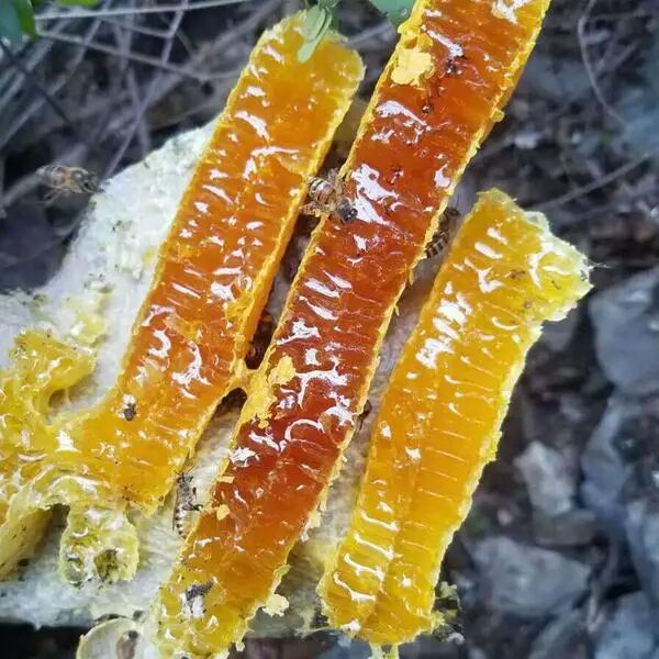 ③修筑巢房:如果是正常的蜂窝结构,蜂蜜一般是不会出现流淌现象的,所以只要是蜂蜜出现了流淌现象,一般都是蜂窝破损的结果,比如养蜂人检查蜂群的时候,弄坏蜂巢,导致蜂蜜外流,在这种情况下,蜜蜂会一边暂时的搬运流淌的蜂蜜和存储流淌的蜂蜜,一边把破损的巢房修补好,避免蜂蜜继续外流。