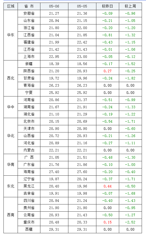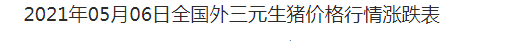 五一小长假没能带动猪民狂欢,节后第一天,五一上班综合症突现,猪民信心下降明显。据中国养猪网数据中心披露,全国生猪一片绿,全饲料一片红,猪农利润依然降,猪周期效应明显。2021年5月6日,据中国养猪网养猪数据中心披露,外三元生猪均价为21.51元/公斤,较昨日下降了0.24元,内三元生猪均价为20.89元/公斤,较昨日下降了0.27元,土杂猪均价为20.32元/公斤,较昨日下跌了0.18元,玉米全国均价为2730元/吨,较昨日上涨了7元,豆粕均价为3599元/吨,较昨日上涨了1元。