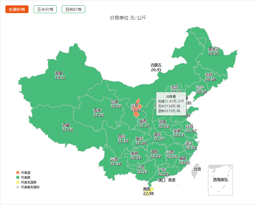 1、从外三元看,市场整体下行,从局部看,只有黑龙江地区出现增长,青海、宁夏、西藏等3个地区和昨天持平,有27个省市区处于下行通道一片绿。从局部市场看,黑龙江猪价较昨日以0.18元的成为全国唯一上涨的“独苗”,北京市生猪价格为20.38元/公斤,较昨日下跌了0.73元,成为了下跌之最。