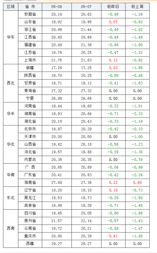 全国有5个省市区处于上涨,占全国市场的16.1%,其中,甘肃省价格为19.91元/公斤,相较于昨日上涨了0.2元,即每吨上涨了200元,为今日上涨最高的地区。有4个省市区价格和昨天持平,占全国市场的12.9%。有22个省市区处于下跌通道,占全国市场的71.0%,其中,湖南省价格为21.26元/公斤,相较于昨日下跌了0.76元,即下跌了760元/吨,为今日下跌最高的地区。