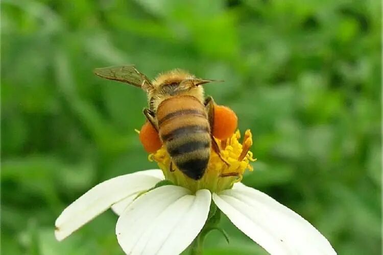 在中午和下午蜜蜂的活动,其实就与蜜蜂和蜜源植物之间的这种默契有关,另外就是我们有的朋友分不清蜜蜂采粉和采蜜,这里有必要说一下,蜜蜂采粉的时候是采集蜜源植物的雄性细胞,是一些花粉颗粒,蜜蜂装在腿上带回蜂巢,这是我们可以看到的,而蜜蜂采蜜是蜜蜂通过吻吸取了蜜源植物蜜腺分泌的甜汁以后,暂时的存储在蜜蜂的蜜胃里面,带回蜂窝以后吐出来加工的过程,所以说花粉蜜蜂是装在腿上,花蜜蜜蜂是装在肚子里面,这样我们就可以来看中午和下午的时候蜜蜂在干嘛了。