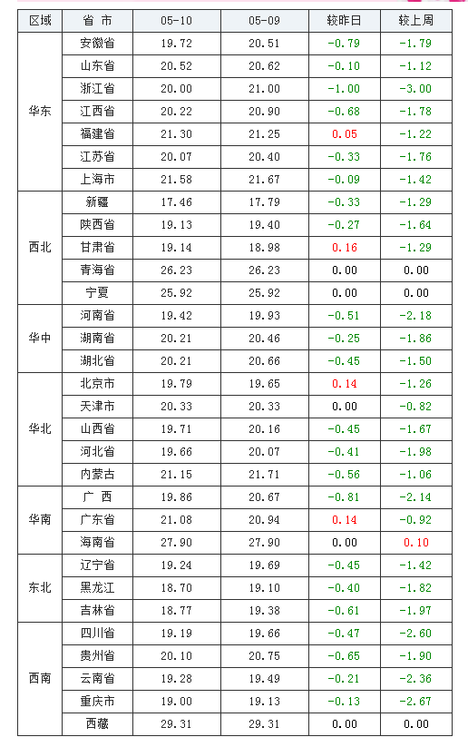 从局部市场看,全国有4个省市区价格上涨,占全国市场的12.9%,其中,甘肃省价格为19.14元/公斤,相较于昨日上涨了0.16元/公斤,即上涨了160元/吨,是今日上涨最高的地区。全国有5个省市区价格和昨日持平,占全国市场的16.1%。处于下行通道的省市区有22个,占全国市场的71%,其中,浙江省价格为20.00元/公斤,相较于昨日下跌了1.00元/公斤,即下跌了1000元/吨,是今日下跌最高的地区。