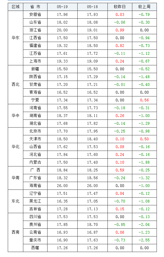 从局部市场看,华东市场7省区有5个上涨,2个省区下跌;西北市场有1个省区上涨,2个省区下跌,2个省区持平;华中市场有1个上涨,2个下跌;华北市场有3个上涨,2个省区下跌,1个省区和昨日持平;华南市场有2个上涨,1个和昨日持平;东北市场有1个上涨,2个省区下跌;西南市场有2个上涨,2个省区下跌,1个省区持平。