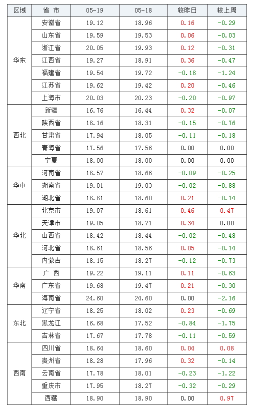 全国均价为18.74元/公斤,价格和昨日持平,终于止住了下跌势头。整体上看,全国上涨的省区有15个,占全国市场的48.4%,下跌省区达到12个,全国市场的38.7%。