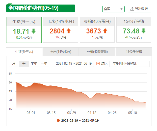 2021年5月18日,据中国养猪网披露,今天猪价又下跌了,虽然外三元生猪和昨天持平,但是,总体来说,生猪还是在下行,而大家习惯的玉米和豆粕价格继续保持上涨,猪粮比进一步收缩到6.63:1,猪价下跌势头看样子有止步回升的趋势,猪农能看到希望了吗?
