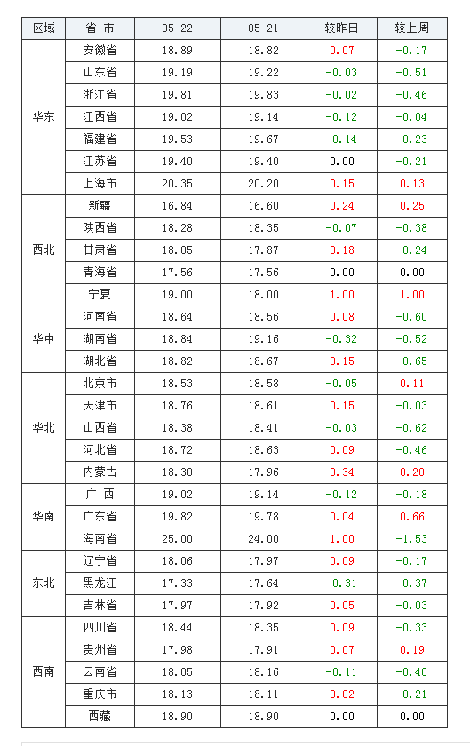 全国均价为17.56元/公斤,相较于昨日下跌了0.01元。从局部市场看,全国有11个省区价格上扬,占全国市场的35.5%,下跌的省区有15个,占全国市场的48.4%。从成交价格上看,海南价格为24.92元/公斤,是今天价格最高的地区,而新疆价格为16.10元/公斤,是价格最低的地区。从涨跌幅度上看,涨幅最大的省区为新疆,上涨了0.77元/公斤,而跌幅最大的省区为福建,下跌了0.90元。