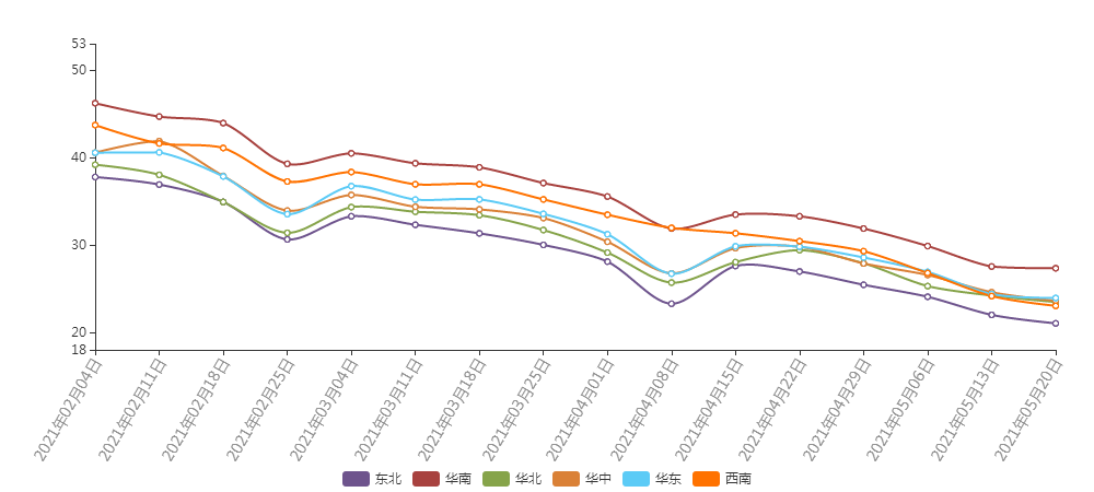 全国均价为18.75元/公斤,相较于昨日上涨了0.02元。全国市场有17个省区价格在上涨,占全国市场的54.8%,有11个省区价格在下跌,占全国市场的35.5%。从价格上看,进入价格最高的省区为海南,价格为25.00元/公斤,为今日价格最高地区,而新疆价格为16.84元/公斤,为今日价格的最低省区。从涨跌幅度看,海南价格上涨了1元/公斤,是今日上涨最高的省区,而湖南省下跌了0.32元/公斤,是今天下跌最多的市场。