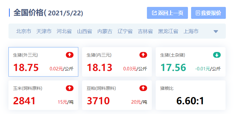 据国家发改委网站最新披露的《2021年5月第2周猪料、鸡料及蛋料比价》显示:5月第2周全国生猪出场价格为21.55元/公斤,环比上周大跌7.75%。5月第2周21.55元/公斤的猪价,创下2019年8月第2周以来新低,较2019年10月第5周猪价最高时已下跌了45.85%,接近腰斩。根据发改委测算的数据,本周全国猪料比价为6.41,环比跌幅8.95%。按目前价格及成本推算,未来生猪养殖头均盈利为22.18元。