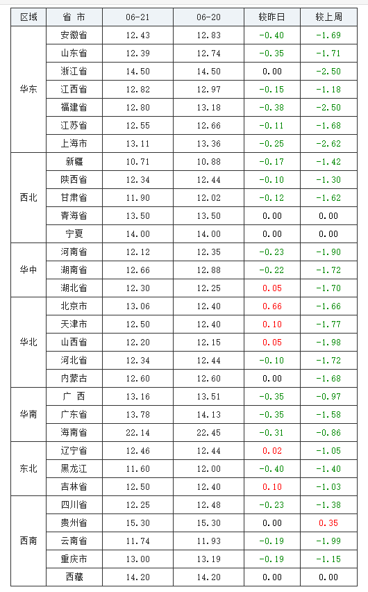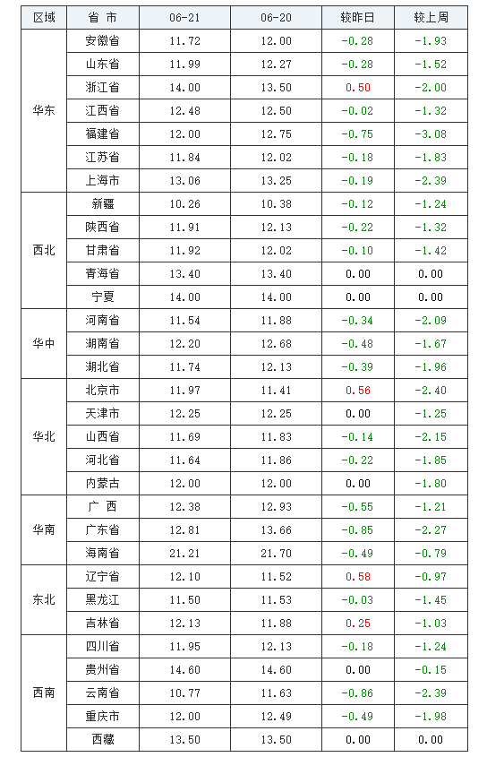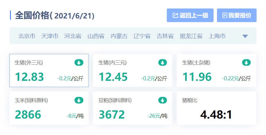 对于内三元生猪来说,今日价格虽然有点少数区域小“飘红”的现象,但是整体上还是难免下跌命运,正如上面的全国数据一样,全国范围内平均一公斤下跌了0.22元,而从全国7大区来看,有6个区域出现了小幅度上涨,其他地区要么停滞不前,要么下跌。