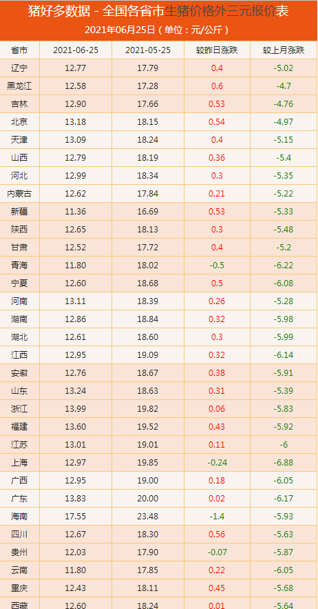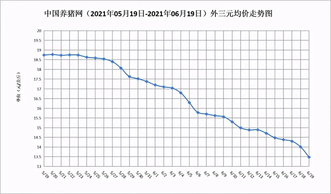 据中国养猪网提供的数据,今日外三元生猪全国均价为13.00元/公斤,较昨日增加了0.25元,环比下跌了30.07%,内三元生猪全国均价为12.63元/公斤,较昨日增加了0.25元,环比下跌了29.83%,土杂猪全国均价为12.25元/公斤,较昨日上涨了0.35元,环比下跌了29.92%。