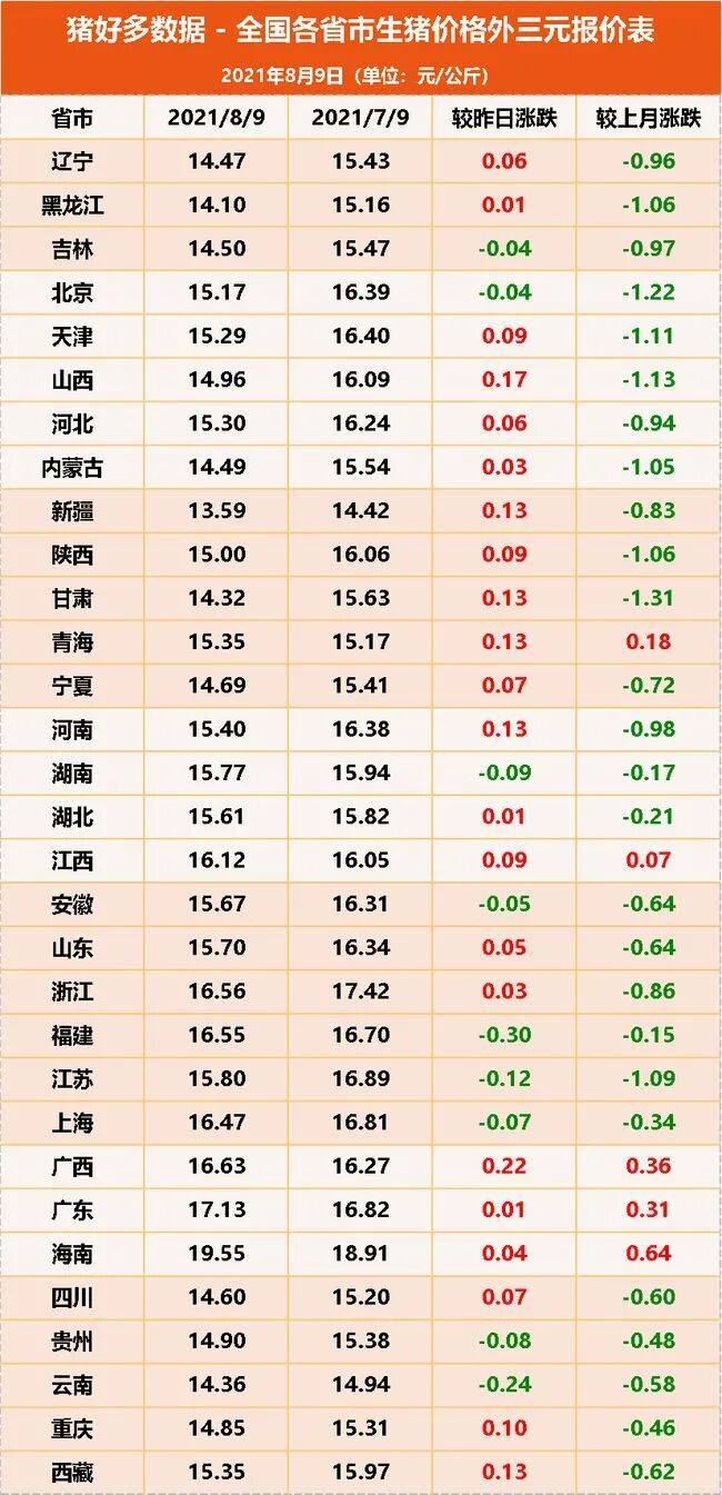 猪价全线上涨,猪价涨幅为0.02-0.21元/千克;