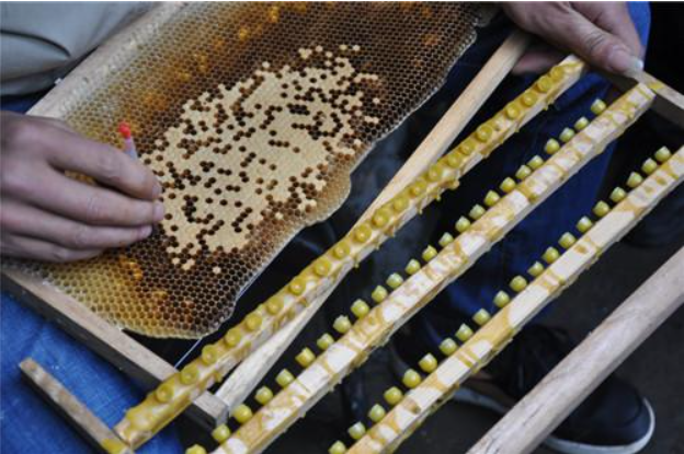 方法是在我们制作好王台杯以后,把王台杯先粘在王台条上,放进育王群中3到4个小时后取出来,然后进行移虫育王,这样工蜂会对我们放进去的王台杯进行清理,把粗糙的地方进行修复,咬掉多余的边缘,更加的符合蜜蜂蜜蜂自然育王的王台形状,这个时候我们再移入幼虫,工蜂接受率自然大大提升,但是需要注意的是,王台杯放入蜂群中修整的时间也不宜过长,否则工蜂可能会把王台杯啃掉。