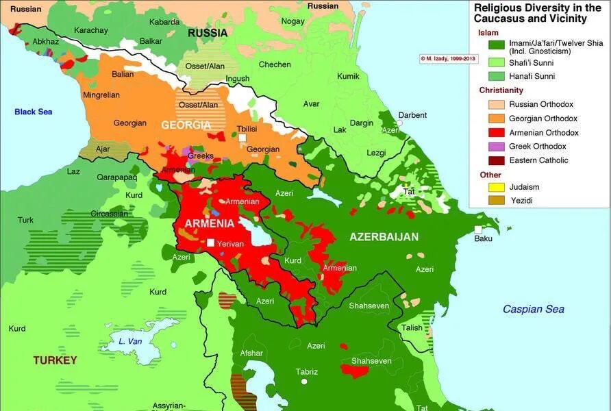 除了民族之外,高加索地区的宗教分布也十分复杂,并且跟语言分布还不太一样:
