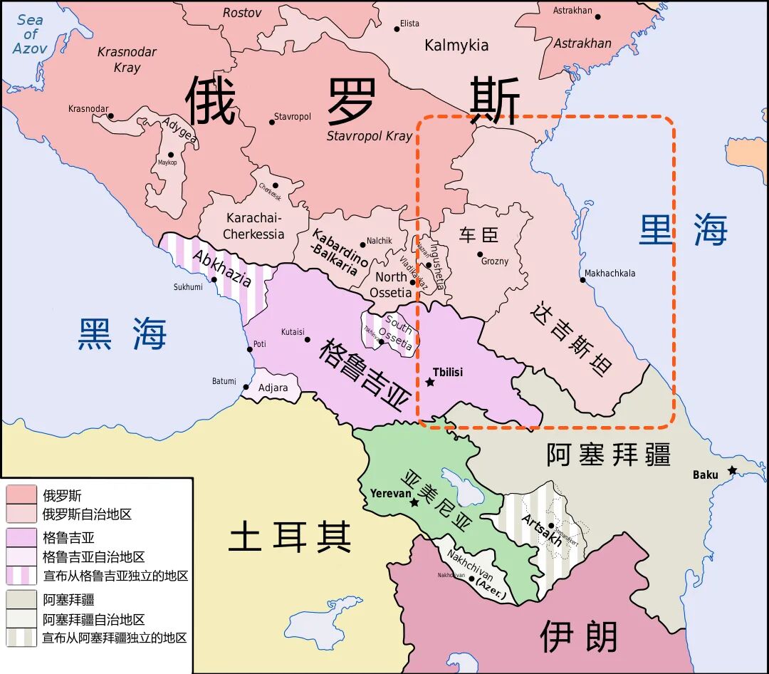 这种复杂的民族和宗教结构,再加上大国之间的角力,导致高加索地区的政治版图格外地支离破碎: