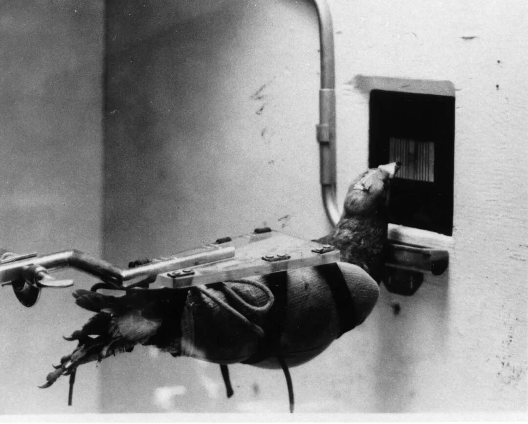 这个时候,一位叫做斯金纳的美国心理学家(是的,我没写错,是心理学家)站了出来,向军方提出了一个解决方案。斯金纳的方案是训练鸽子在屏幕上用嘴去啄移动的军舰图案。当鸽子完成训练之后,把它们放进炸弹前面的小舱室里。在炸弹被轰炸机丢下以后,鸽子能通过炸弹前端的透明电子屏幕看到水面上的军舰,这时它就会按照训练中的那样反复用嘴去啄屏幕上的军舰。根据鸽子啄击点的不同,炸弹可以对尾翼角度进行微调,确保目标军舰永远处在导弹的飞行路线上。