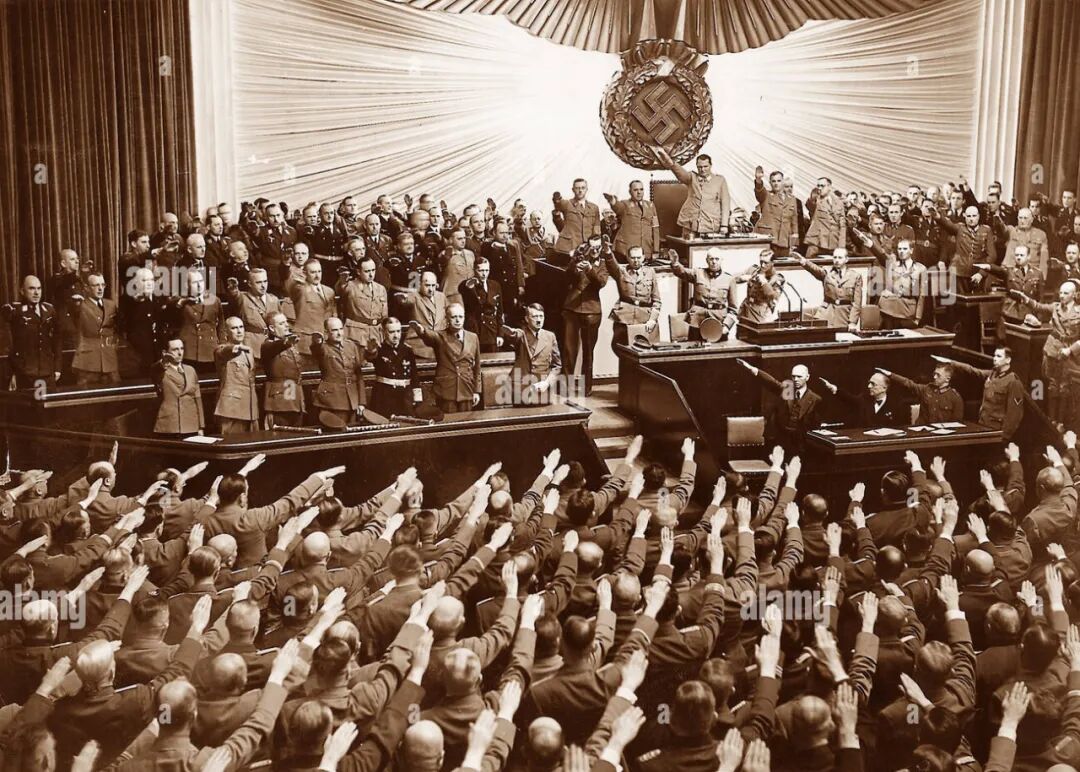这些演讲正是希特勒能够带领纳粹党获取政权的法宝之一。他总是亲手撰写和修改自己所有的演讲稿。在这件事上,他不相信任何人。1933年,希特勒被任命为总理,纳粹党与国家人民党共同组成联合内阁。1934年,德国总统兴登堡病逝。内阁提交了一个法案,要求把总统职权转授给总理,使希特勒成为元首。这个法案在德国全民公投中获得了将近90%的支持。