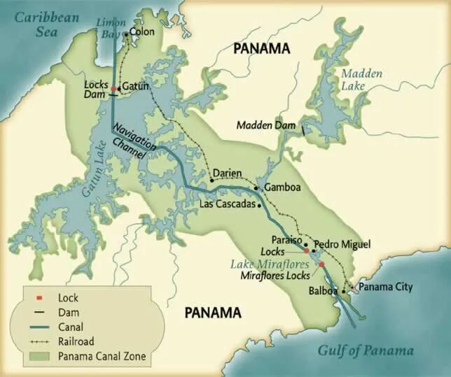 这里要特别说明的是,整条苏伊士运河的水位高度是和它所连接的两片海洋相同的。也就是说,一艘船从地中海驶入红海,期间这艘船船身下的水面高度不会有任何的变化。这艘船像平常一样沿着运河开过去就好了。在雷塞布的计划中,巴拿马运河也应该是这样一条运河,这就意味着他必须把沿途碰到的山脉全部都挖到海平面的高度。
