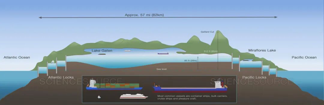 上面这张图片显示了巴拿马船闸系统的工作方式。当船只抵达运河的一端时,先是利用三个船闸逐级升高,到达海拔26米的湖面,然后行驶大概82公里后,再通过三级船闸降低高度,驶入另外一片大洋。