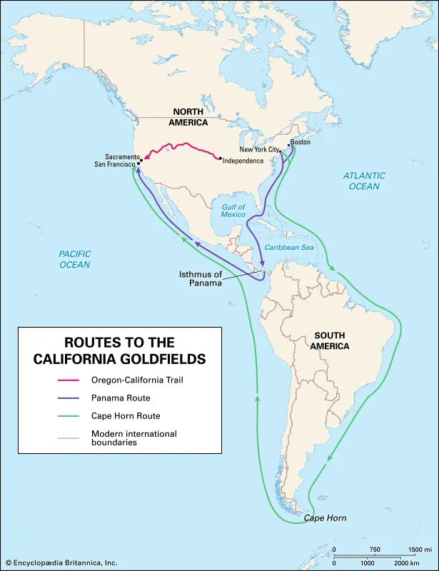 1848年,有人加州发现了金矿。从第二年开始,有无数的人从东部出发前往西海岸,梦想着一夜暴富。从美国东部前往加州最便捷的路线是什么呢?从地图上看好像走陆路是最好的选择。但其实不然。在这个年代乘坐大篷车穿越美洲要遭遇诸多不便和危险,整个旅途要花上七个月的时间。