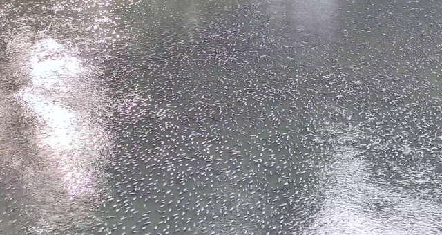 而这些密密麻麻的鱼群,竟然引来的大量飞鸟捕食。