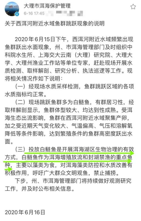 官方发布的声明里,也提到了为了治理水藻,鲢鱼重点投放