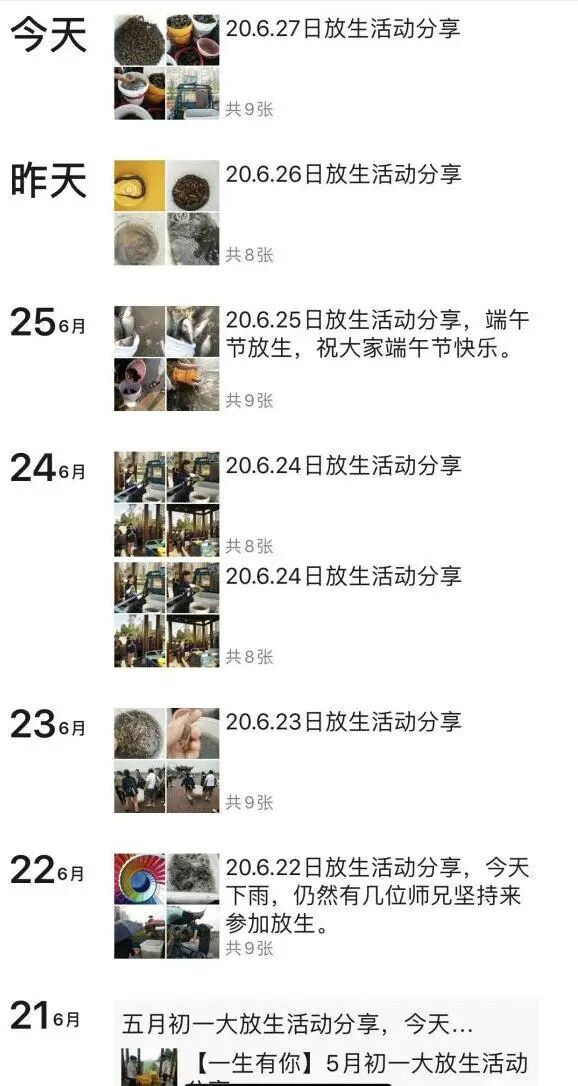 浙江温州,一位放生者的朋友圈,几乎每隔几天就去河边放生一次,可以说非常“善心”了。