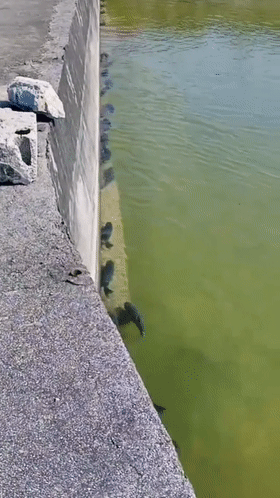 只见一群乌黑的大鱼贴着水泥坝一排排游过,看起来有趣又令人感觉非常的疑惑——河里的鱼为何会做出这种令人吃惊的举动?