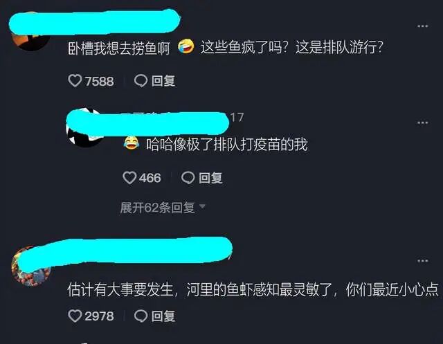 另外,还有网友表示河里鱼群排队游非常反常,事情不简单——他认为“估计有大事要发生,河里的鱼虾感知最灵敏了,你们最近小心点”……