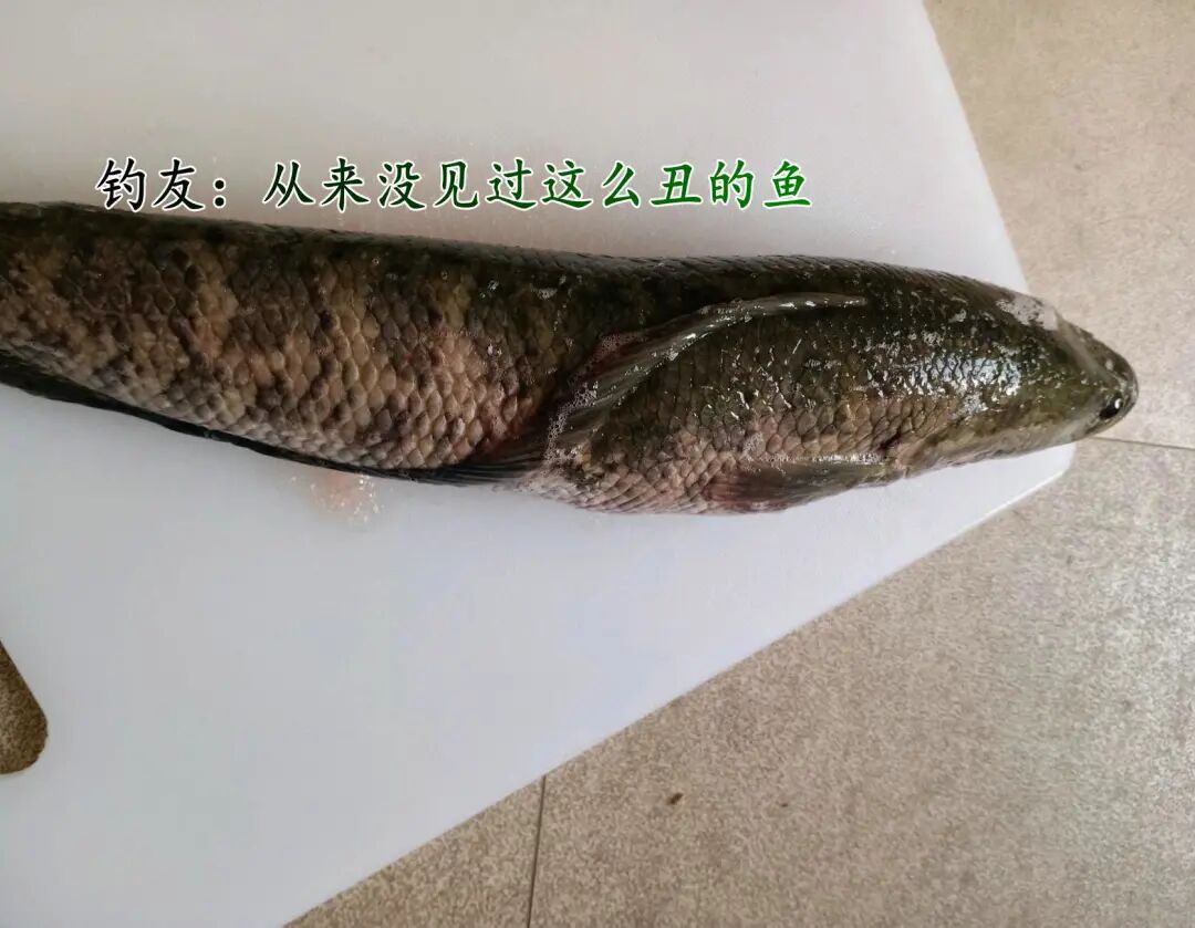 比如下面这位广东惠州的男子,半夜钓回来一条黑鱼,当时黑灯瞎火的也没细看,第二天男子将这条鱼捞起来准备吃酸菜鱼,却被它的外形给惊住了.......