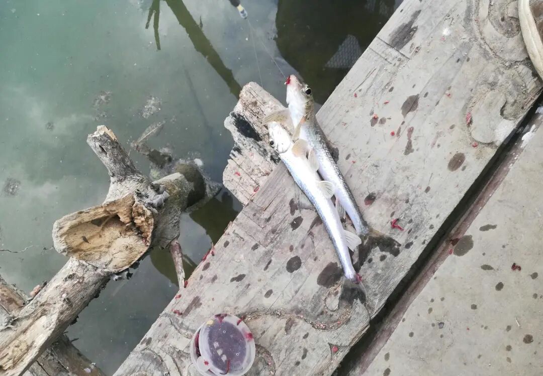 好在这位钓友及时改用红虫做鱼饵,加上细线袖钩,一个小时也钓了几十条鱼,基本都是船钉子。