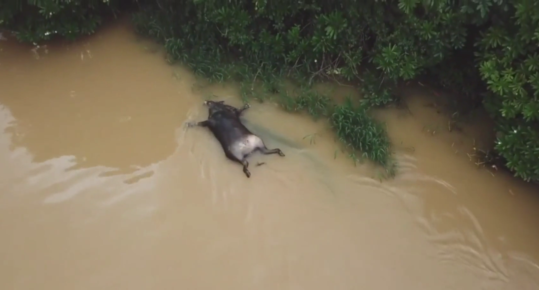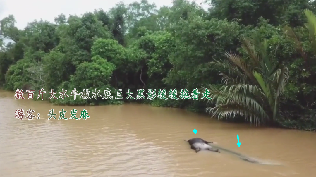而他拿起手机拍摄后,镜头里的画面让他瞬间头皮发麻——这头大水牛早已死去多时,甚至已经开始鼓胀,而让它看起来在游动的原因,竟是水底下有一条巨大的黑影在拖着它前行……