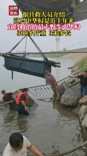 营救人员朱佳志表示,这条受伤的中华鲟有三米多长、300多斤重——虽然宜昌每年都会放生许多人工培育的中华鲟,但因为总体放流历史有限,应该是没有这么大的个体。