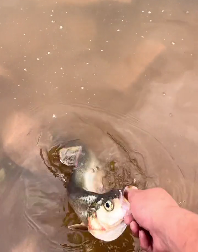 就在这位钓友无聊之下收竿,准备洗手走人时,忽然发现江岸不远处有一条翘嘴鱼浮在水面,随后就发生了上面的这一幕。