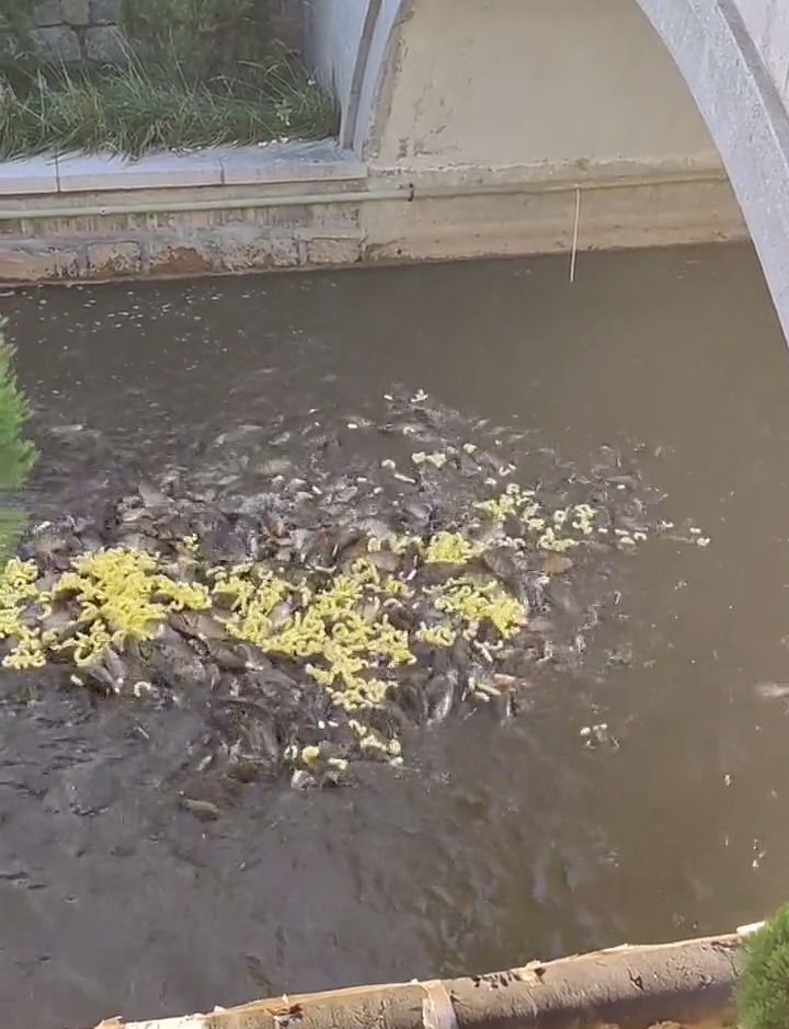 只见一位男子将一大袋子鱼食从桥上洒落,短暂的平静后,整个河面忽然水花四溅仿佛沸腾了一样,继而变成一片乌黑——竟然都是汹涌而来的鱼,青黑色的鱼背甚至将这个水面染成乌黑色。