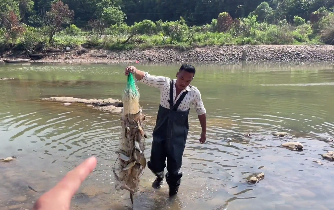 比如这位老乡黄师傅捕了有十几斤鱼,他表示只需30元就能全部拿走——最后被现场的这位当地户外主播讨价还价一番后,以20元的价格全部买走了。