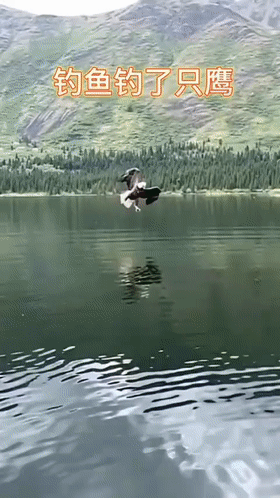 而下面这位钓鱼人好不容易将一条大鱼拖出水面,却忽然惊得叫出声来——一头大鸟从天而降,1秒不到的时间就掠过水面,并抢走了他的鱼。