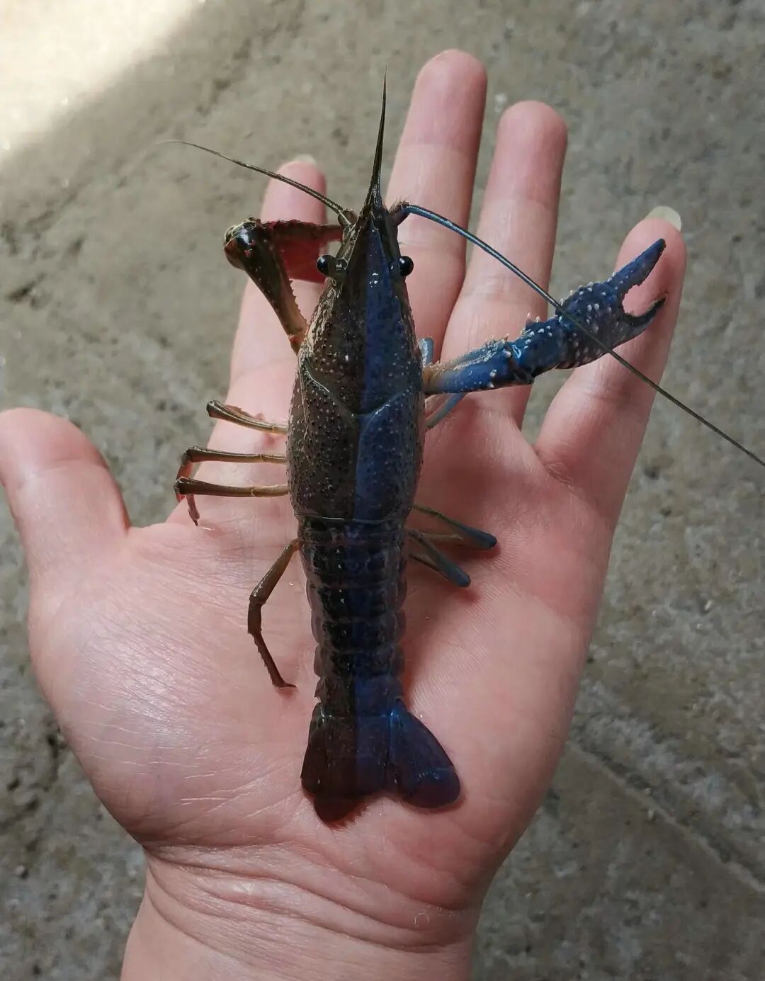 “从来没见过这样的(小龙虾),身上一半是红的,一半是蓝的,还是很对称,一开始我还以为是自己眼花了,仔细看跟个阴阳图一样!村里人看了都说不能吃!”
