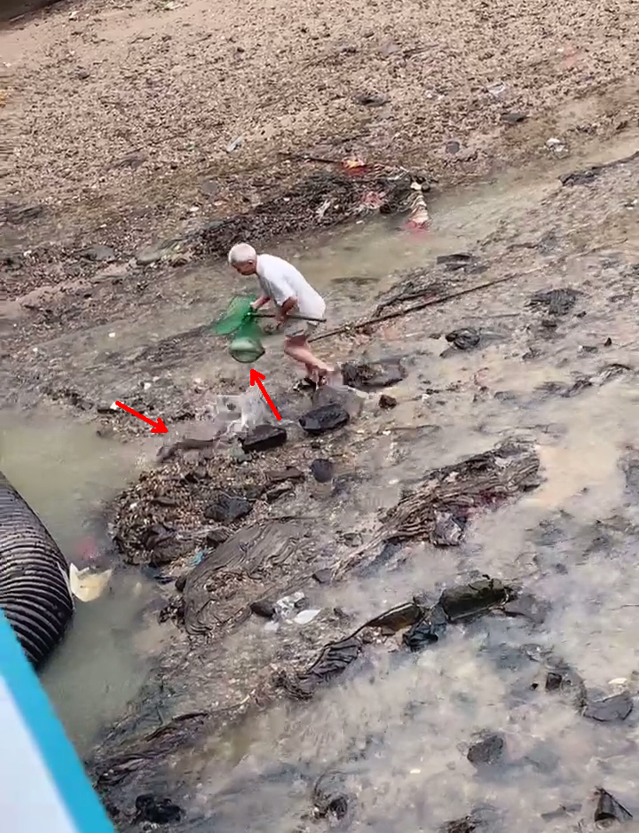 老伯抄网里捉了一条,还在追另一条