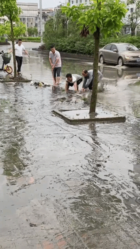 "这个(积水)下面是一个下水道的排水口,这几个老兄就蹲在这里等鱼上来,好多的大鱼哈哈哈,看他们抓鱼可开心了。”