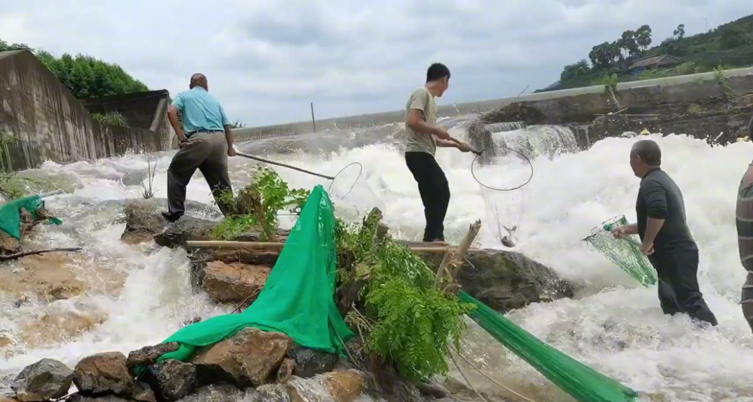 因此最近每天都有大量水库鱼群逃窜下来,而水流湍急、下游河道石头又多,这些冲下来的大鱼往往被摔得不轻,附近的村民赶来轻松就捕获。