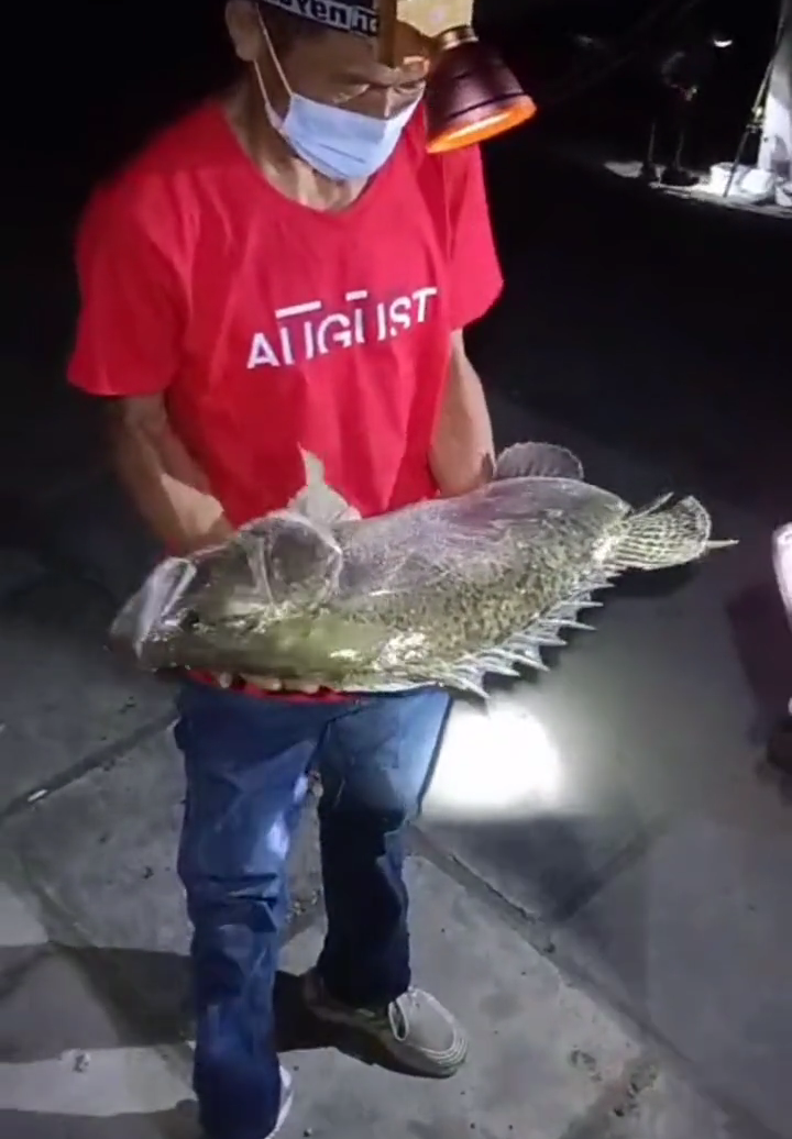 在开闸现场,最幸运的当属下面这位宿迁的老乡,他在闸口下不远下网时,竟捞起一条“乌黑的大鱼”,就着照明灯一看,竟是一条从未见过的“老鳜鱼”。