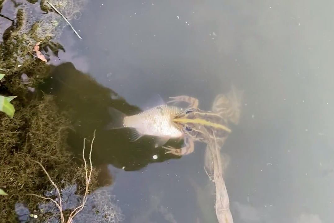 “一开始看到半条鱼,还以为是一条死鱼,仔细一看竟然是被一只蛤蟆(应该是只青蛙)吞进嘴里,这蛤蟆还能吃鱼?”