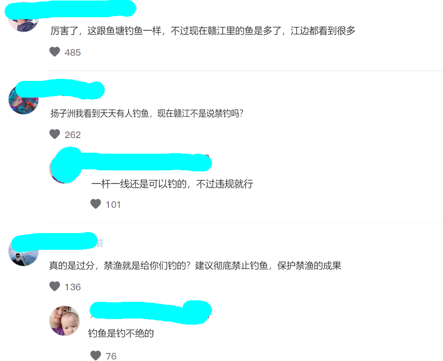 甚至有名称为@昌江阿钦的网友气愤表示:有鱼就死命钓,这样钓鱼比电鱼的还狠,应该彻底禁钓,保护赣江禁渔的成果。