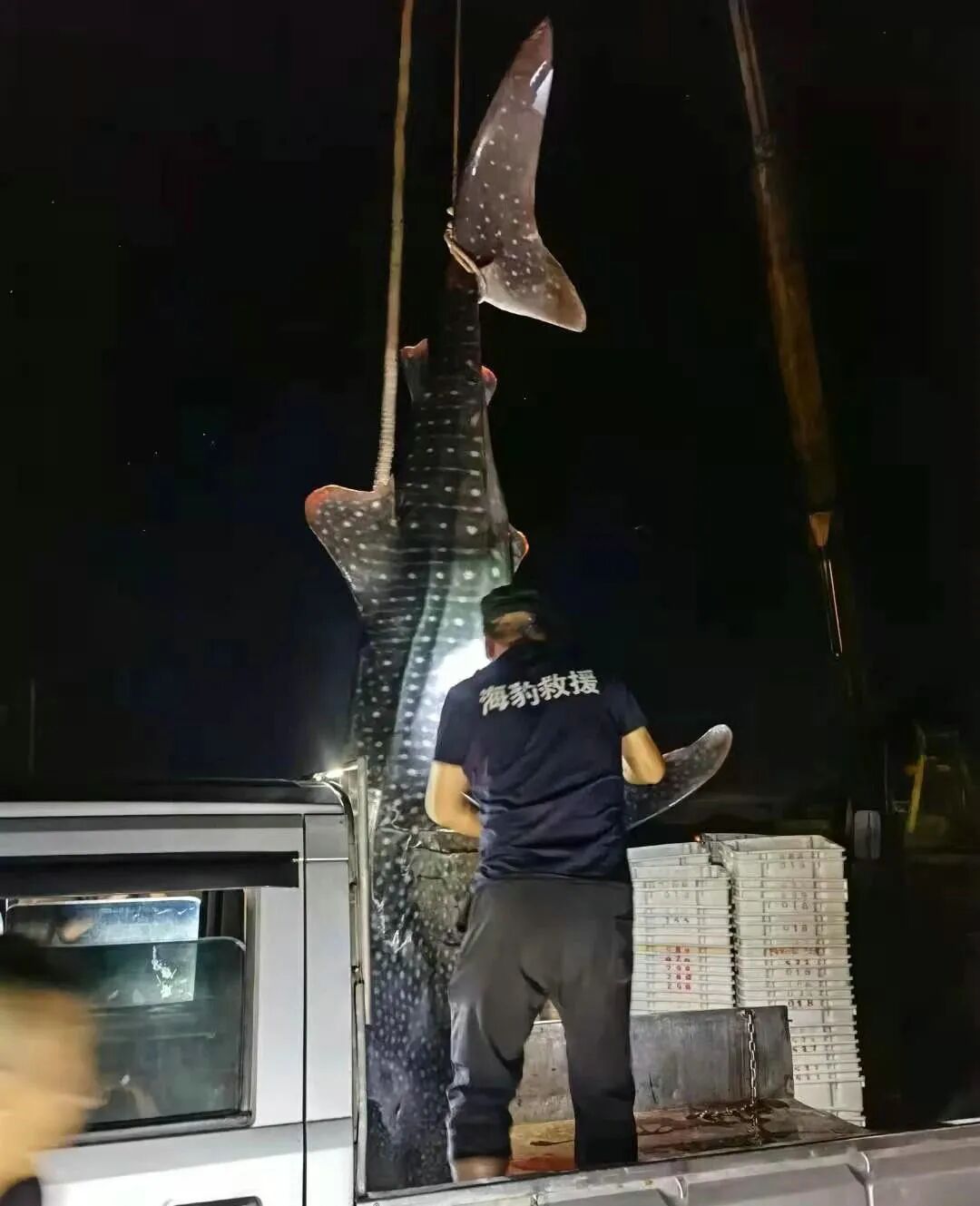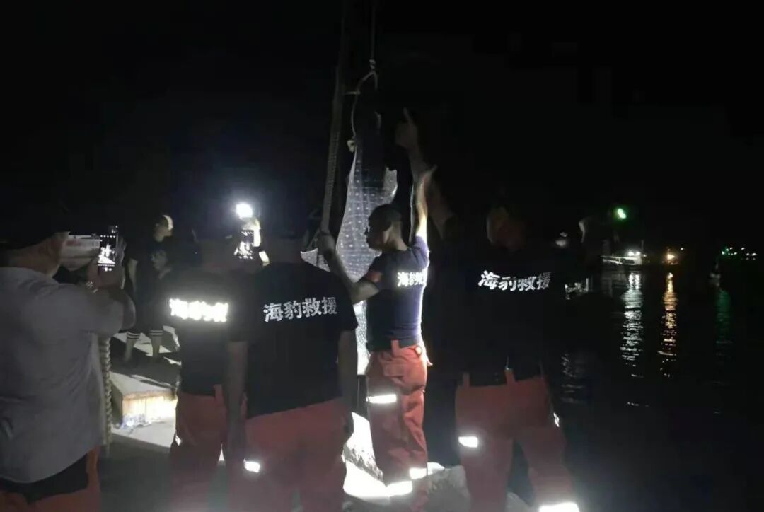 但可惜的是,工作人员赶到时,这条庞然大物已经死去,只能将其捞起并送到当地的海洋与渔业执法大队。