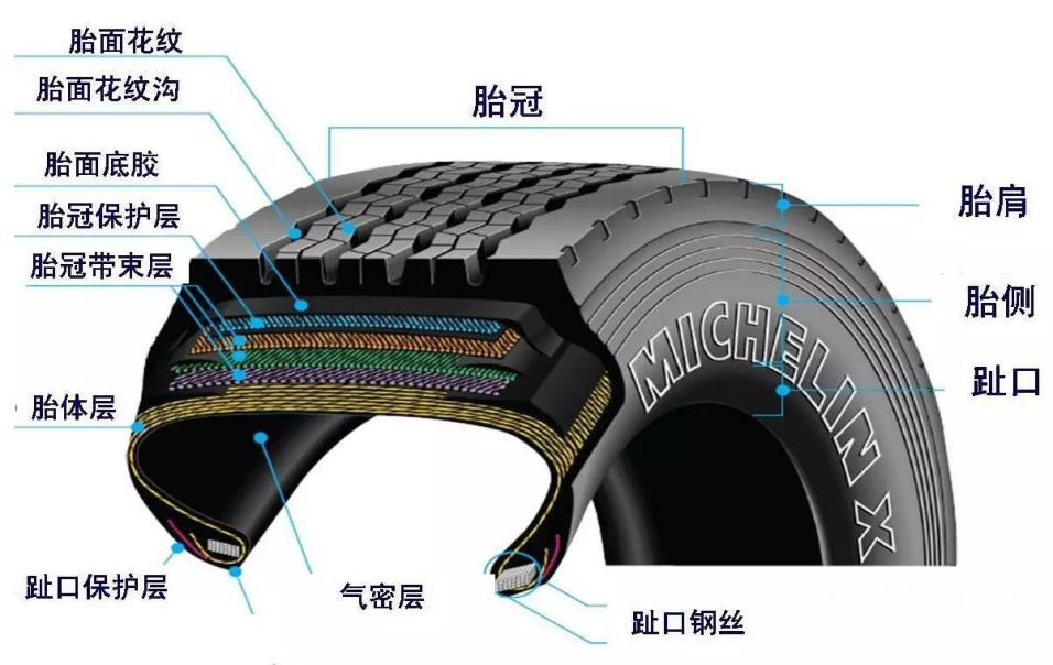 充气轮胎主要由橡胶部件和帘布层构成,别看外表上轮胎都是橡胶,但橡胶在轮胎胎体中只起到组合胎体各部件、密封、耐磨、抗刺扎及部分缓冲作用,真正“出力”的是隐藏在橡胶里面的帘布。