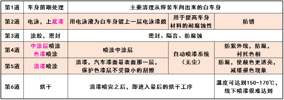 说起作用,就不得不说一下车厂的喷漆工艺和流程;原厂喷涂车间的各项加工工艺极其繁琐,不同品牌还会有所不同,但一般可分为6道工序。