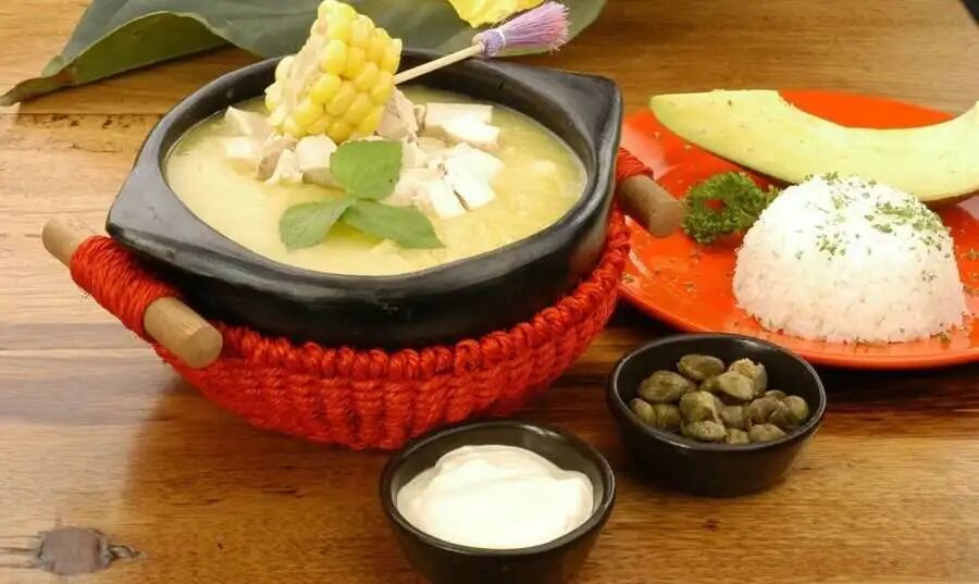 如果你问当地人哥伦比亚的特色菜品是什么,他们一定会说是ajiaco con pollo. 它是波哥大及周边地区的代表性汤品。主要是由Patatas amarillas colombianas(哥伦比亚黄色马铃薯)、Mazorca(玉米段)、Pollo(鸡肉)、Arracha(美洲根芹)还有Crema de leche(奶油)熬制而成的浓汤: