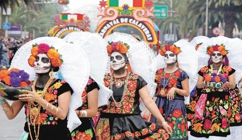 从11月1日开始,墨西哥各地的人穿上特定的服装参加游行和派对,并且用黑白两色将脸画成骷髅头的样子,以此来展现对生命的尊重以及对逝去亲人的怀念。